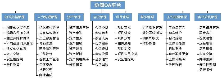 不仅包含传统 OA 的所有内容,更在横向上进行了扩充,纵向上进行了深化,涉足企业经营管理的几乎所有的方面,应用完全集成,无需企业重复购置。